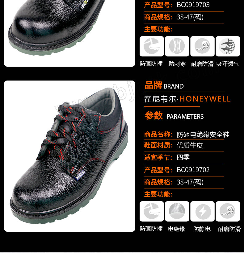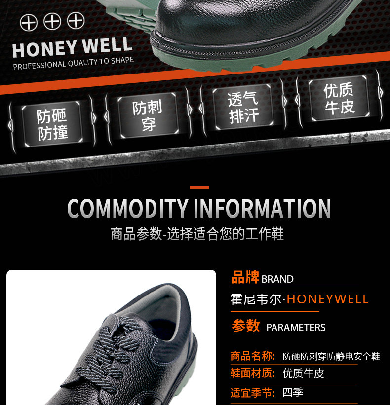 HONEYWELL霍尼韦尔 ECO系列低帮牛皮安全鞋 BC0919703 黑色 防砸防静电防刺穿